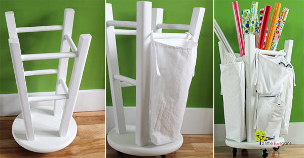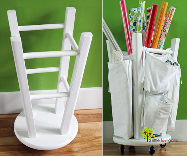 從事繪圖美術、美工設計相關行業的朋友們,家裡應該有很多包裝紙、畫紙、緞帶以及一堆小工具等等,不知道大家是如何收納這些包裝紙和小物品呢?來自美國全職媽媽 Christina 在她的 2 Little Hooligans 部落格提供一個蠻妙的收納方式,只要一個圓椅凳!!你一定很好奇,圓椅凳可以拿來收納嗎?