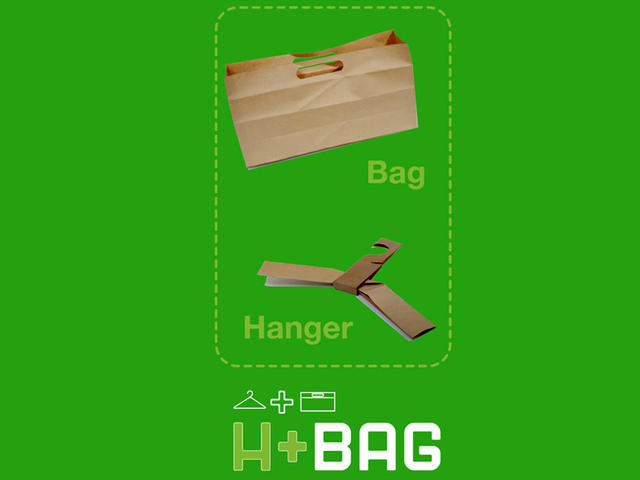 由三位韓國設計 Younha Hwang、Hyojun Jeon和Minjae Kwan 發想,利用長形紙袋,經過幾個簡單的對折動作就能組裝成一個衣架,概念產品名為 H+BAG,製作的門檻技巧很低,頂多練習個幾次就可以拿捏到適當比例,看起來挺有趣的,於是大人物編輯就拿了個牛皮紙袋照表操課一番,完全憑直覺東折西剪,大概五分鐘就弄完一個: