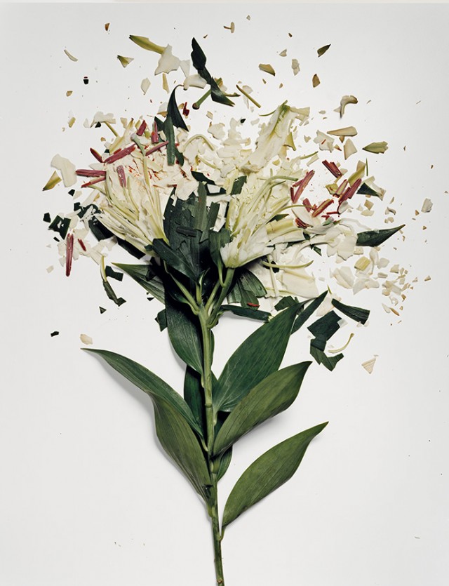 Jon Shireman 利用液態氮作為媒介(約零下 196℃),將花朵們浸置在液體中約半個小時,等凍結之後再將它們敲碎。碎裂的花瓣細末和新鮮的色彩形成強烈對比,線條分別的破碎面表現出植物原先所沒有的脆硬感,彷彿碎裂的不是真正的花朵、而是一株株玻璃藝術品!