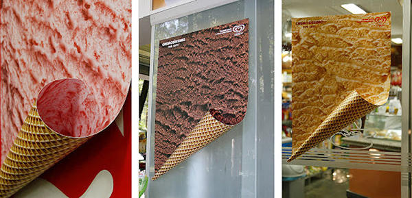 在巴西一間冰淇淋公司「Kibon」特別請設計師「Renata El Dib」設計了一系列超酷的冰淇淋海報,將整面海報印上嬌豔欲滴的冰淇淋,神來一筆的將紙卷成甜筒狀,就這樣完成了擬真度超高的冰淇淋廣告,看了是不是很想火速來一隻阿!