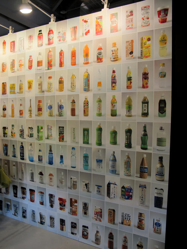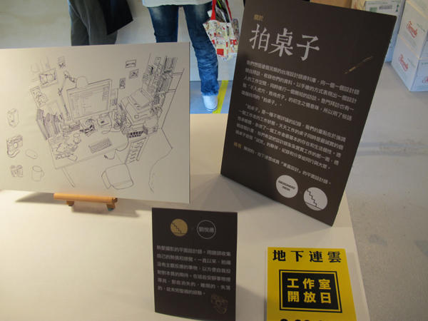 快接近3X3區域的尾聲時,會看到超有趣一整面由紅色排列到咖啡色的日系飲料,光是這面牆就可以強烈說明「地下連雲」的社長吳東龍有多熱愛日系的設計,更不用提去日本玩設計看藝術必備的書籍『東京設計誌』了。既然提到「地下連雲」,簡單介紹一下這個既是團隊也是個體的及設計大成工作室,由八個獨立工作室組成,一開始我們看到的『拍桌子』,是由「東喜設計」的平面設計師親手繪製其他設計師的雜亂桌子仰視圖,濃厚的手感風味讓人忍不住也想要一頭栽進這張東西繁多又似乎有一套自己整齊系統的設計世界中。