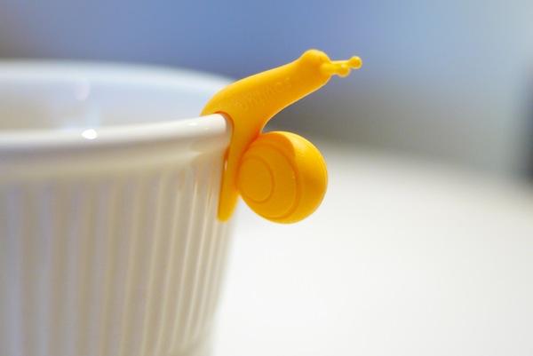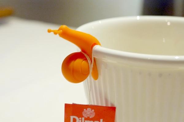 是時候要展現小蝸牛的第二項絕學了,那就是….「掛茶包」!別聽這招式名稱不怎麼厲害,但有時這種說大不大,說小不小的問題最令人煩躁了!有了派對蝸牛就能把細細的棉繩與標籤固定在上頭,不會喝到一半就得動手撈標籤。