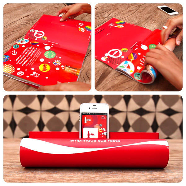 只要將雜誌攤開後,迅速捲成平常打蟑螂的形態,快!左邊有好大一隻蟑螂,接著把封面的紙板卡榫固定,不到十秒鐘就可以完成一台不用插電,俐落好看又環保的雜誌紙喇叭。跟所有的揚聲器一樣,運用共振的原理將聲響放大,簡單卻很實用的創意、方便好攜帶的特性、彷彿可樂易開罐的俐落造型,加上眾多可樂迷的擁護,讓特刊一推出就造成搶購。