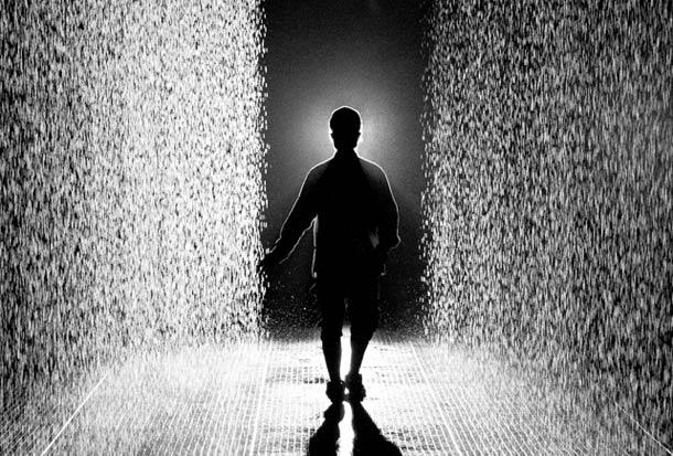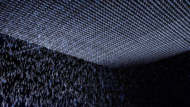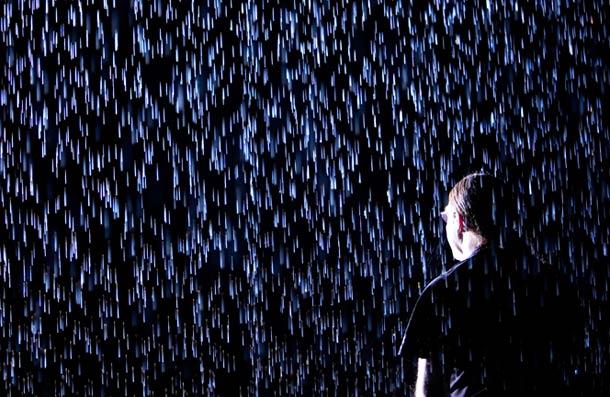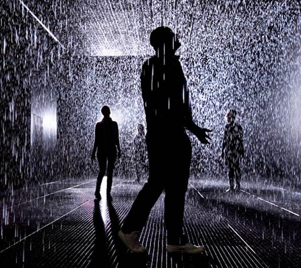 rAndom團隊在倫都的Barbican藝術館裡打造一間人和雨能和平共處的空間「Rain Room」,他們利用3D追蹤攝影技術、液壓管理系統和成千上萬的噴嘴控制,讓人可以漫步在雨中,卻完全不會被雨淋濕。正確的來說,是人走到哪裡,雨水就會巧妙的閃躲開來。而地板也經過特殊設計,讓雨水快速流入回收系統,不浪費每一滴水,同時讓乾爽度更加提升,連鞋子都不會弄濕,真的是好自在!