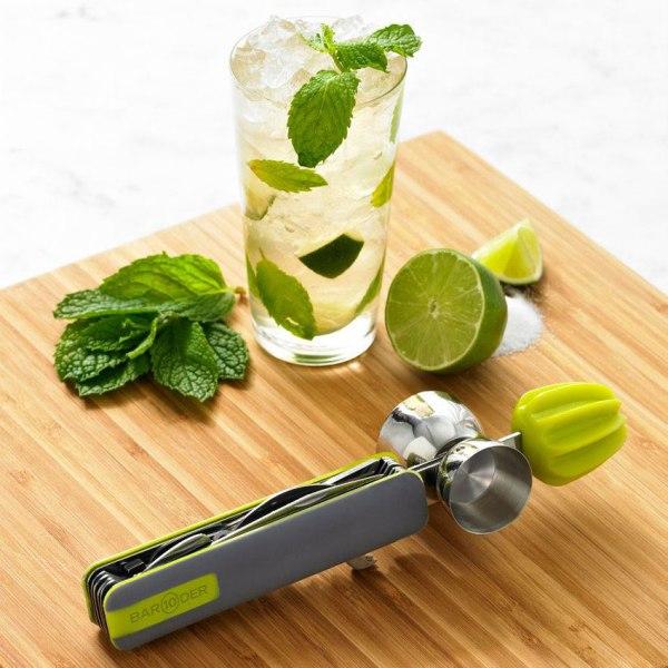 十項全能的隨身酒保沒想到連榨汁機都帶在身上,把整支榨汁機拉出來還能放到杯中當調味榨器(Muddler,把飲料中的配料擠壓出味道的器材),添加一點天然果汁的調酒既能增加風味,而且喝起來還能騙自己比較健康。