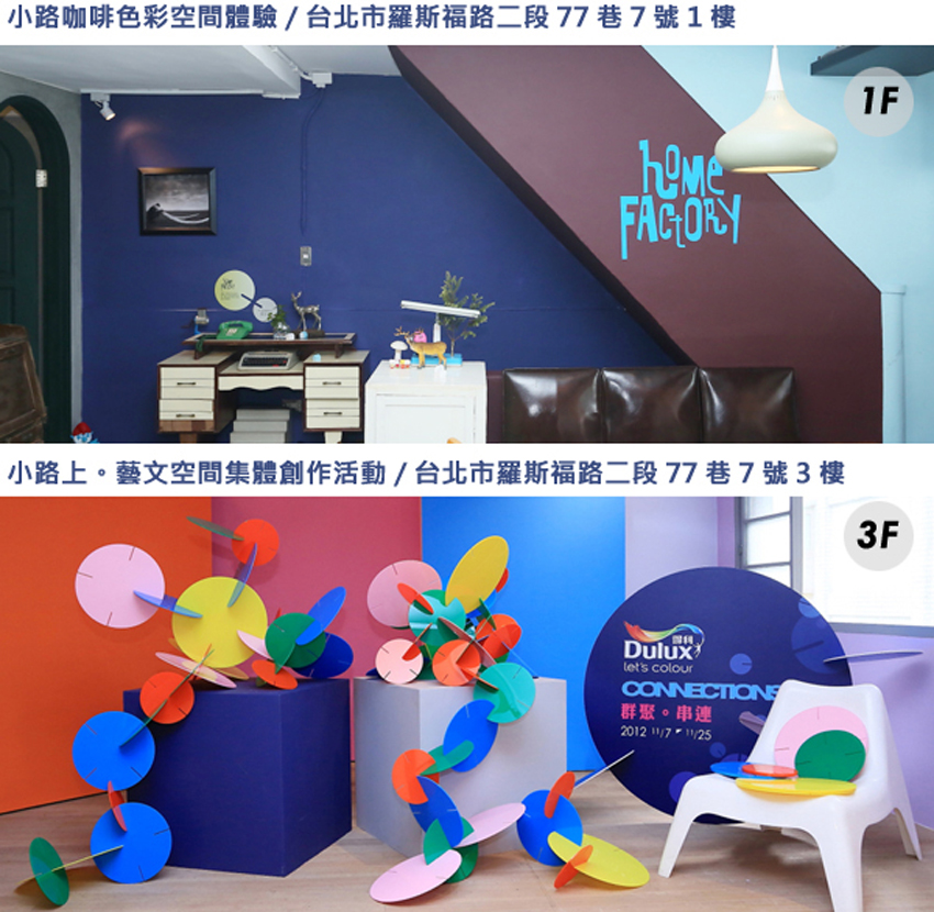 即日起至 2012 年 11 月 25 日前在小路咖啡 (台北市羅斯福路二段77巷7號) 1 樓有 2013 Dulux 年度趨勢色彩的體驗空間,3 樓有集體創作活動,拍下你親自參與組合彩色圓形扣片的照片,上傳至 Let’s Color Taiwan 臉書粉絲團 並寫下你最有感覺的年度色彩趨勢,就有機會獲得「得利電腦調色乳膠漆 1 公升 1 桶」。