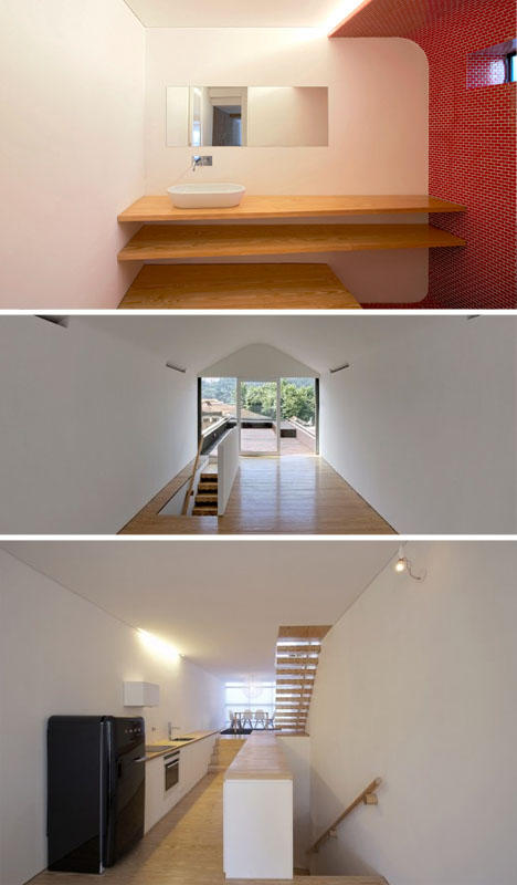 在葡萄牙,建築師事務所Ezzo就接下了類似的任務,幫一間四層樓的民宅來個舊宅大變身,設計師保留了原本的建築結構、木頭樑柱,以及灰濛濛的大理石外牆,幫室內重新粉刷成符合現代簡單主義的白色,以「舊皮新血」的方式,重新裝修整棟房子,比較傷腦筋的是,公寓雖然號稱有四層樓,每層樓的高度卻不怎麼平均,該怎麼做才能讓屋主生活得更舒適呢?