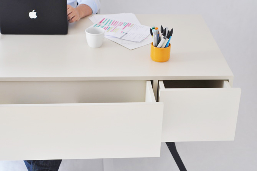這款辦公桌的抽屜,在使用者的對面,當你要起身拿文件資料時不得不站起來繞到桌子的另一邊,如此一來就可以克服屁股總是緊黏著椅子的問題了!