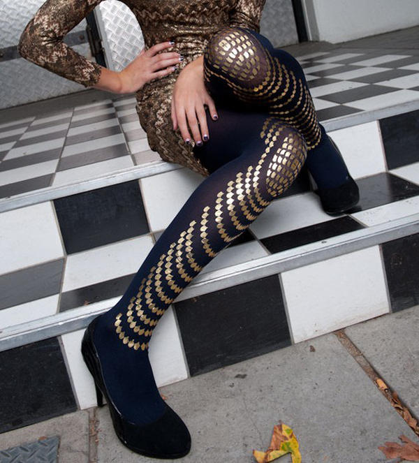 喜歡典雅的一點的,則可以參考在 Etsy 網站的一名網友「Gal Stern's Profile」所設計的一系列結合了金屬與絲襪的商品,全部由手工製作的絲襪每雙都比現在流行的刺青絲襪更炫,閃閃發光的金屬設計幫每條腿加分不少。