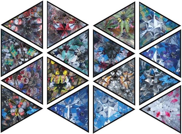 原來這個三角形的垃圾桶內裝入了三面玻璃,就像是萬花筒一樣,經由不斷反射而產生繽紛的花樣,只是這些圖案從以往的亮片、碎紙花變成了一個又一個的垃圾,每當丟入新垃圾後就會變化出不同的風貌。
