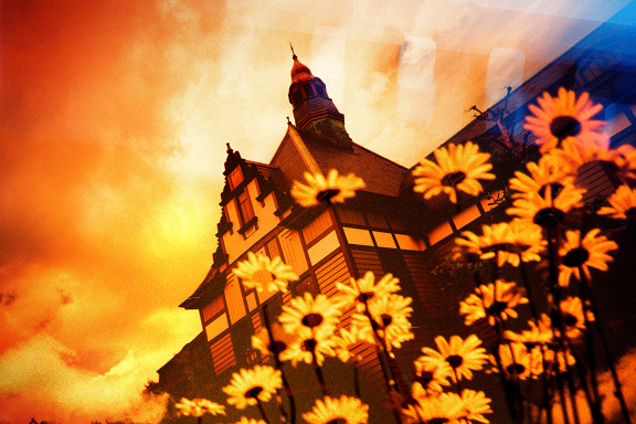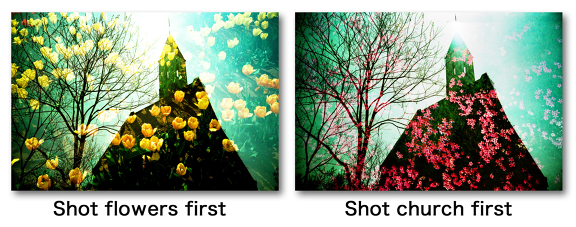 一幅好的重曝攝影作品有個大特色: 由兩幅清晰且色彩鮮明的影像構成。 就上圖為例,佈滿整個畫面的鮮黃色鬱金香與外型明確的教堂交迭,形成了很奪目的一幅照片。