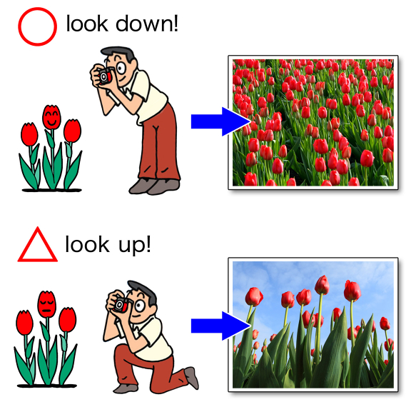 如果花群不高,最好從較高角度拍攝,但不要拍到天空。因為過度的光線會影響到花卉的顯色度。如拍攝小型花朵,嘗試將焦距調製 0.8m,盡量拉近拍攝距離。如果花朵四周的影像過黑,就不要拍到它們了。至於 ISO 設定,就視乎光源而定。面對充足光線時 ISO 不需太高,上面那幅作品就用了 ISO 200 的設定。