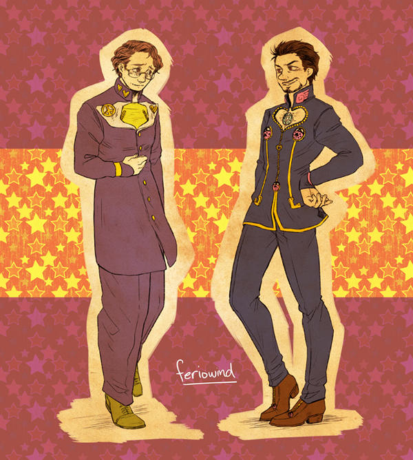 ▲還沒變身前很穩重的浩克穿著出現在JOJO第四部中「東方丈助」的學生服,鋼鐵人穿的是第五部中「喬魯諾喬巴拿」的衣服。