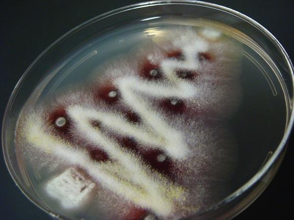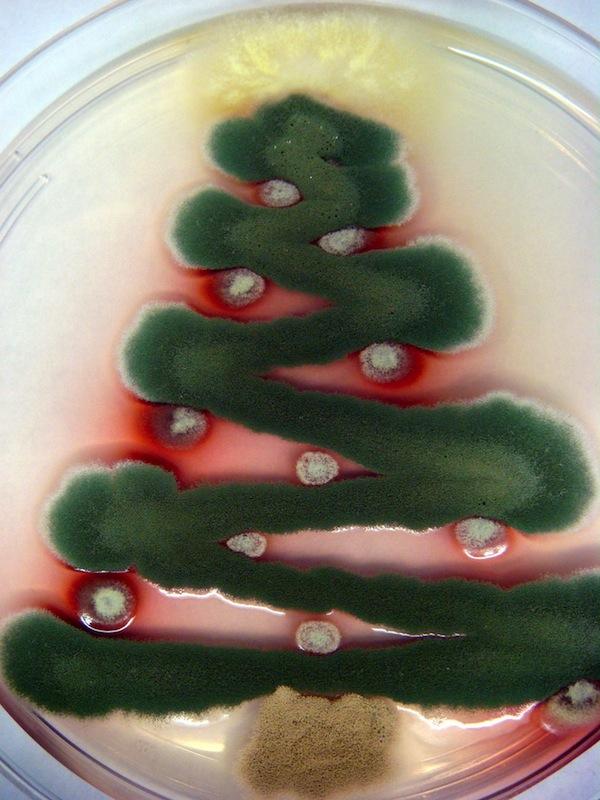 多年後的今天發現我們都錯怪了這位同學,原來黴菌是真的可以拿來做藝術創作啊!美國J. Craig Venter生物科學研究所裡的Stephanie Mounaud在工作之餘,創作出這一系列慶賀聖誕節的可愛圖案。培養皿中這些聖誕樹千真萬確是由平常被大家視為噁心象徵的黴菌所打造,鮮豔繽紛的色彩,搭配上毛茸茸的感覺,瞬間讓大家對黴菌改觀!
