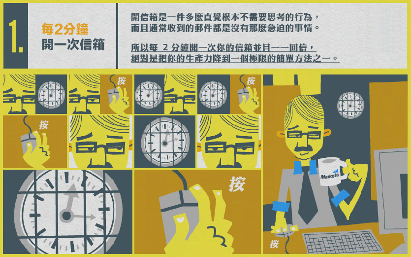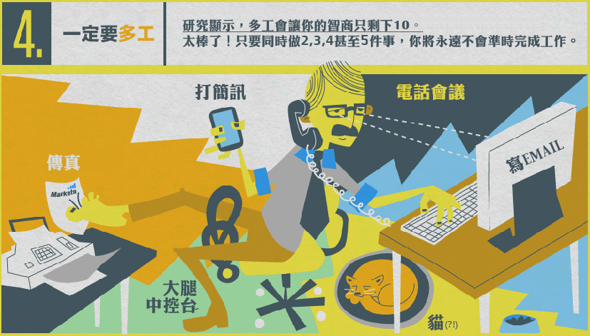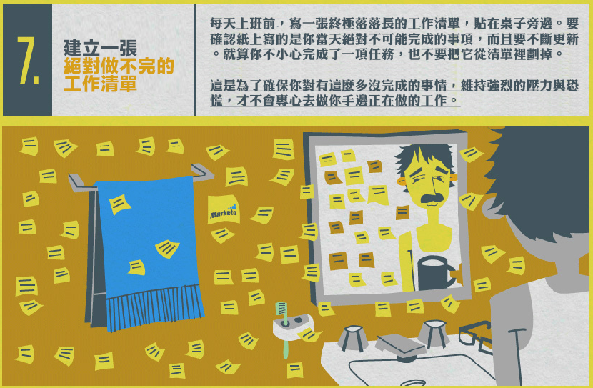 22K最近又掀起一陣波瀾,學會終極裝忙殺時間的秘技來好好「按捺」老闆是一定要的,不論將這張 infographic 當做正面教材或負面教材,請一定要小心不要被你老闆看見。當然,如果想提高生產力再來個蛇寶寶,圖上的作法反過來做就行了,編輯群們關心您~