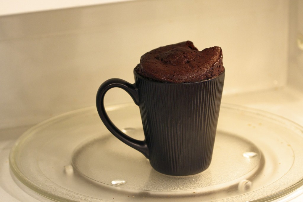 想做甜點也是可以的,來看看這個名副其實的花生巧克力杯子蛋糕。在杯裡放入 4 匙糖、3 匙可可粉、4 匙麵粉、3 匙牛奶、3 匙植物油,以及香濃花生醬和一顆蛋,用打蛋器打到能夠順利攪拌,再微波 1 分半到 3 分鐘,巧克力蛋糕將膨得剛好。完成後,在上面擠上奶油花,看起來非常美味,誰會相信這竟是微波爐烘烤的呢!