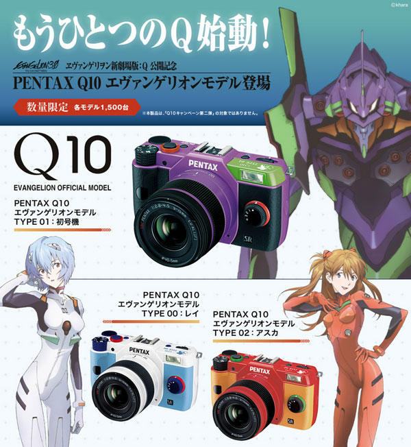 該款限量機一共推出:TYPE00:凌波零、TYPE01:初号機、TYPE02:明日香三款,每款限量只有 1,500 台,為了紀念『新世紀福音戰士劇場版:Q』公開上映,聯合推出了擁有同名的「PENTAX Q10 X 新世紀福音戰士」,除了配色不同之外其他機能均與 PENTAX Q10 相同,頂部閃光燈印有醒目的 NERV 楓葉圖案與機體型號,開機時也會顯示經典的圖案,包裝盒當然也經過特別設計,不知道有沒有打中各位 EVA 迷的心呢?