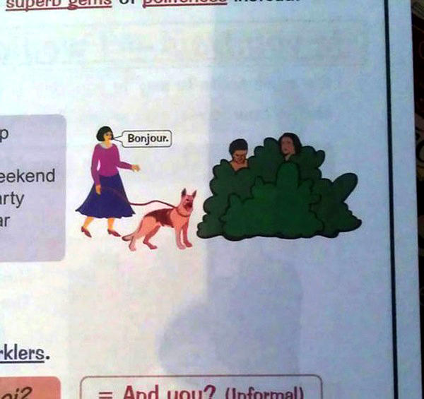 ▲一個正在遛狗用法語說「你好」的夫人,但定睛一看,夫人你在跟草叢裡的一男一女打招呼嗎!?(為什麼你們會在草叢中…)