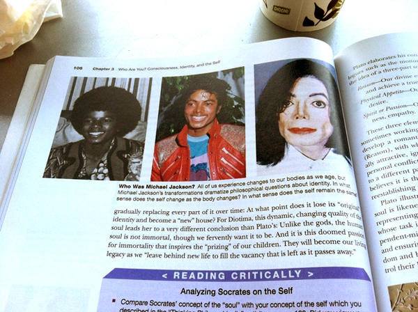 ▲用 Micheal Jackson 的三個時期照片來說明哲學中的身分認知問題果然還是有點怪怪的。(Micheal Jackson的律師不打算對肖像權提告嗎XD)