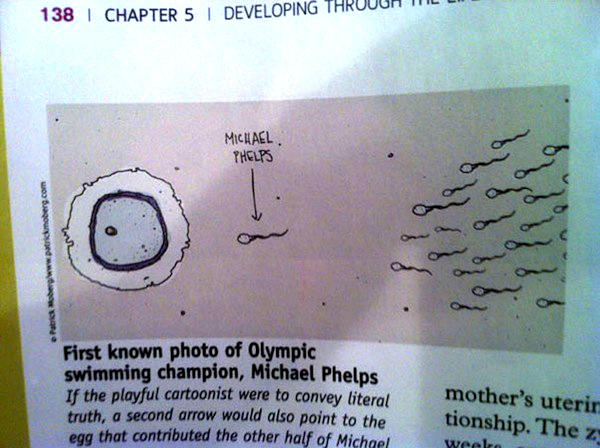 ▲這是一張說明受精的插圖,游泳第一名的精蟲上標示著 Michael Phelps,但是用精蟲來表達Michael Phelps的事蹟怎麼想都不是很妥當阿!!!
