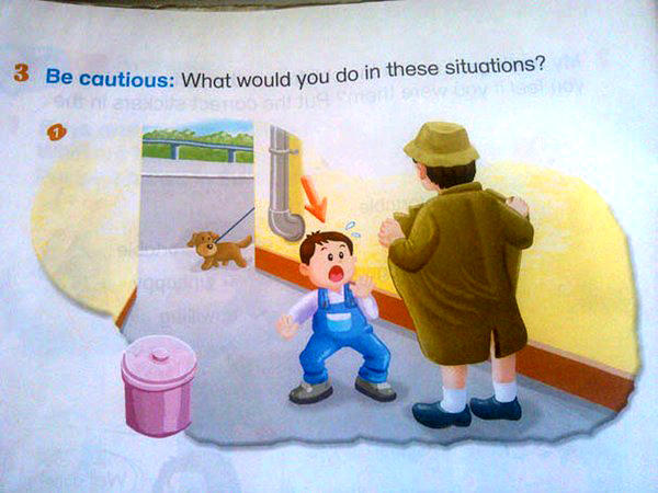 ▲這是中國的英文教科書,想請問當你遇到這種情況的時候該怎麼辦?(小朋友快逃阿!!)