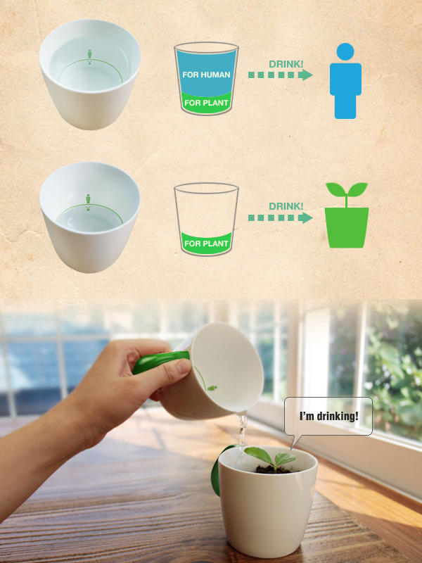 有著可愛嫩芽把手的馬克杯最奧妙之處在於內部所繪製的水位線,線條上標示著人類,而下方則是植物,目的就是希望提醒使用者每天在喝水的時能夠把底下的水留給心愛的盆栽,營造出一種「你一口我一口」的溫馨感覺。不過當然也不能一天喝十杯水就澆十次花,這樣小盆栽可會受不了,太多的愛也會讓對方有沒辦法喘氣的感覺啊!