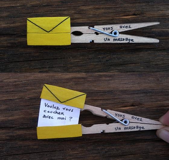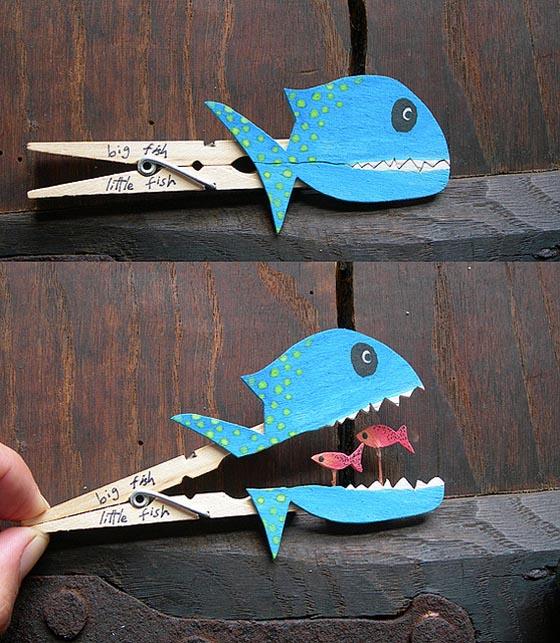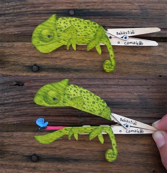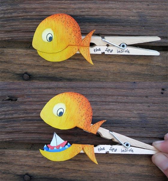 來自葡萄牙的藝術家Molas & Co做了一系列的有著小小故事的曬衣夾創作,而這些創作相當適合老師和家長們教導小朋友一起動手玩創意。首先請小朋友想像什麼東西是可以上下打開,像是信封、嘴巴、禮物之類的,不管是物品或是動物都可以做出很多聯想,決定之後就是想像打開這個東西到底會出現什麼呢?