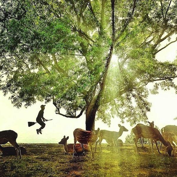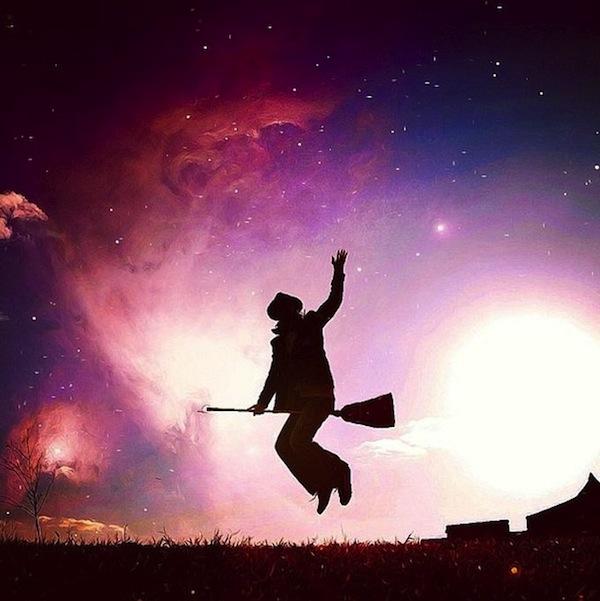 除了極速奔馳的軋車照以外,當然還是要保有魔法世界的神奇氛圍,主打夢幻路線的照片利用背光拍攝出剪影效果,再加上非常方便的修圖軟體以及一點特效,瞬間讓飛天掃把照從KUSO感十足的照片變成婚紗照等級的夢幻美照。
