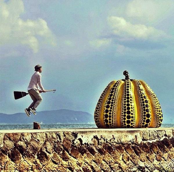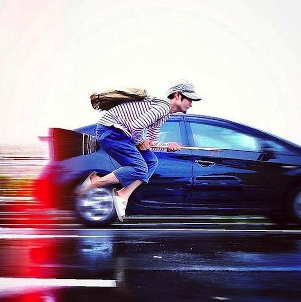 Halno利用身後的交通工具與指標牌來帶出速度感和方向感,尤其是這張與汽車競速的照片看起來超級熱血,頗有重型機車和超跑迷最愛的追焦照的味道。他在目前最當紅的照片分享平台Instagram張貼自己的飛天掃把漂浮照,短短時間內就吸引超過5000位追蹤者,也在世界各地重新引起漂浮熱潮。