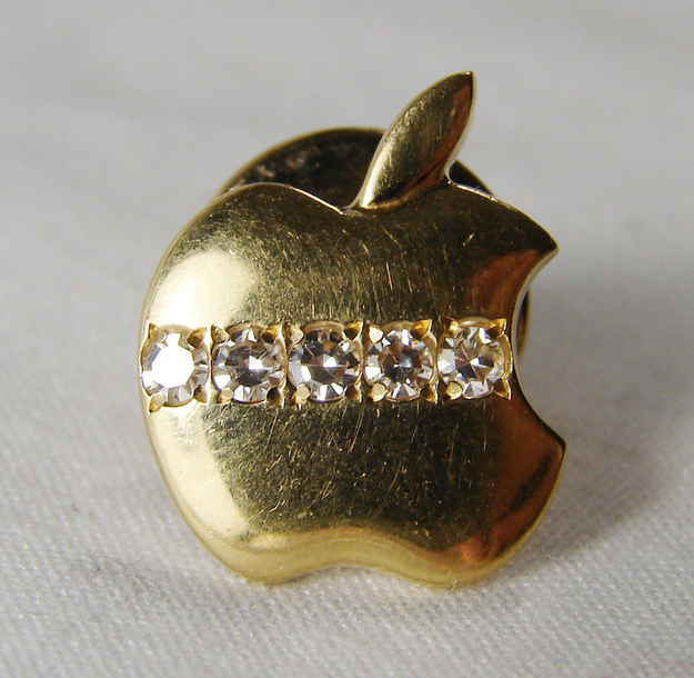 40.在蘋果電腦服務滿5年的大頭針,鑲鑽的18K金蘋果Logo,拍賣價1049.99美金。
