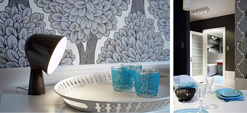 一般鮮少接觸美術設計的朋友可能有會陌生,其實在台灣有上千家的廣告招牌設計公司,你只要 google 大圖輸出就能找到家裡附近的輸出公司。來自波蘭的設計公司 FABRYKA WNETRZ 巧妙以大圖輸出代替壁紙,在客廳沙發後牆上貼上一張近 4 公尺的黑白攝影作品,再與其它邊牆上的壁紙穿插配出層次感,很不錯看喔。提醒大家,大圖輸出價格有高有低,差別在紙質上,下單前請先問清楚老闆不同紙質的差異喔。