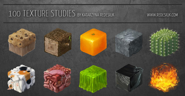 而最近他更是執行了一個叫做「紋理 100 款」的企劃,利用手繪的方式,把許多平常我們看得到的紋理繪製出來,這個企劃猛一聽感覺上有點不太聰明,畢竟市面上已經有許多販售素材的網站,但是和以往我們所見的不太一樣的是,作者並不是用圓形當做基底,而是困難度更高上八層樓的正方體,不僅要考慮到所見的三面不同陰影程度光線折射,更要考量方塊體直角位置的表現手法,甚至完成 100 種不一樣的挑戰,這樣的質感模擬大挑戰確實也幫了很多素人插畫家素材的研發阿!