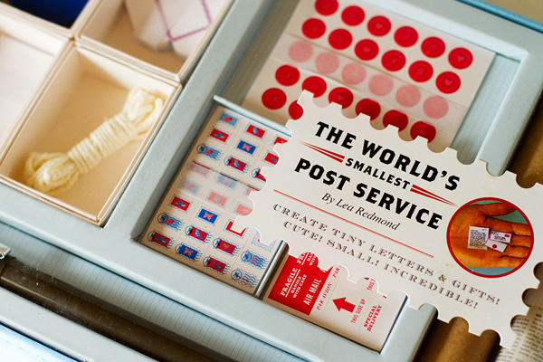 Leaf cutter designs 設計工作室推出了一款微型郵政系統組合包,裡面包含了超級可愛的信封、信紙、郵票、包裝紙、和製作包裹的材料,雖然無法真正寄送給朋友,卻可以體驗一下好久沒有過的手寫風味,讓現在更難執行實體郵件寄送的小朋友們製作看看也是很不錯的教學活動。