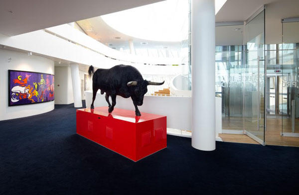 歐洲的 Saxo 銀行老闆可能是藝術愛好者,該銀行利用許多的當代藝術品增加工作環境的創新、設計、視覺藝術氣息,以增進員工們的熱情、創意、積極和效率。在 2008 年由 3XN 建築事務所規劃建造的 Saxo 銀行,利用許多空白的空間,擺設大量的丹麥藝術家作品,讓遊走其中的人們對這間銀行產生許多好奇心與非凡的感受。