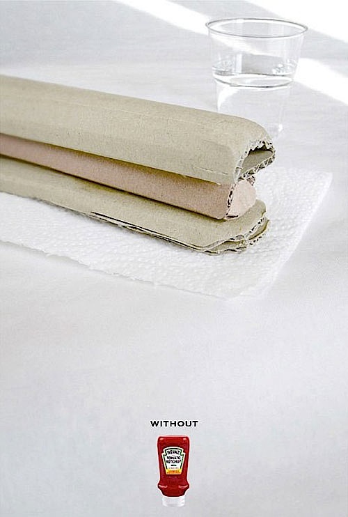 早餐非得要擠上一大坨的番茄醬,似乎是世界各地的通則(台灣還多了一味醬油膏)。對許多人來說早餐如果少了醬料簡直食之無味,Heinz 番茄醬讓這種「食之無味」的感受具像化,釋出了一系列讓人點頭如搗蒜的平面廣告。相信喜愛醬料的人們將會心有靈犀的吶喊:「沒錯!」。
