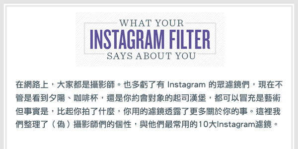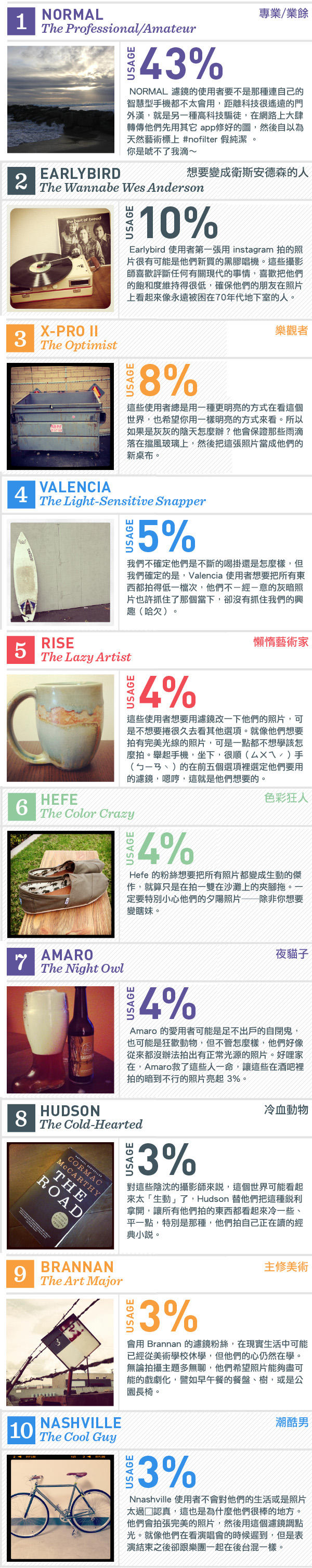 智慧型手機的崛起,讓很多人除了臉書之外,更是每天都盯著手機執行各種 APP 軟體,instagram 更是讓每個人的拍照技巧從一知半解化身為攝影大師,你也有每天使用這個 APP 的習慣嗎?最常用的濾鏡是哪款呢?快來看看吧!