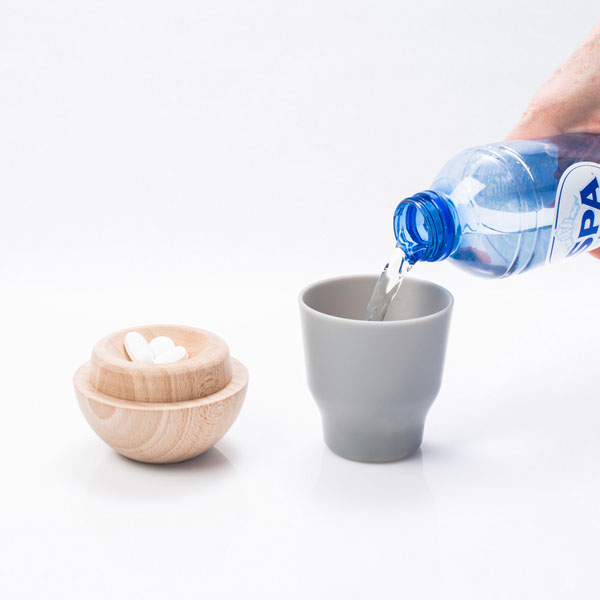 由比利時設計師 Quentin de Coster 設計,這組藥罐仿照俄羅斯娃娃的玩法,由一個木底座加上三個大小不同的杯子組成,重點就在於每個杯子底部都有淺淺的凹槽,將它們一字排開後,能夠呈現出整齊的設計感,而實際用途則是用來放置特定份量的藥物,一方面可以替年紀較長的長輩把關用藥、避免他們忘記今天該吃的種類,具有設計感的藥罐用起來心情也會比較輕鬆,或許多少可以改變長輩們拒絕吃藥的想法喔。
