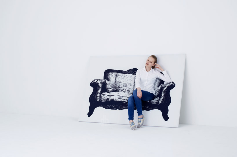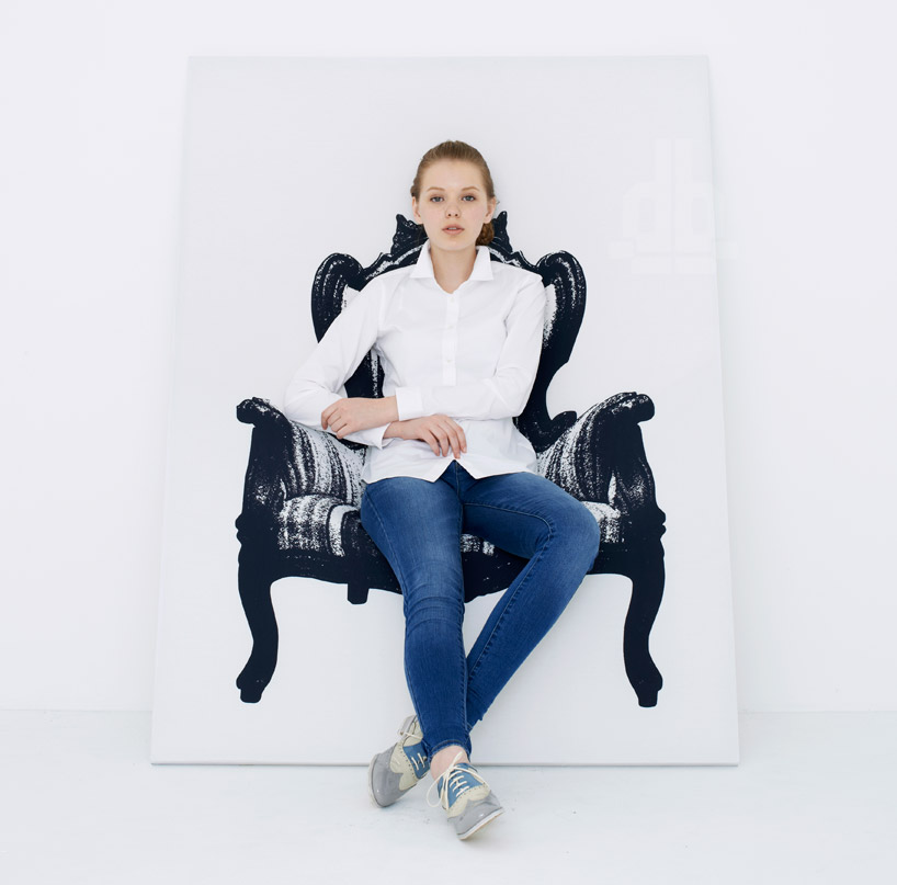 2013 年米蘭 Salone Satellite 衛星展裡出現這麼一幅掛畫,斜倚在牆邊讓人以為只是普通的場地佈景,想不到它居然是真的可以坐的椅子,這跟我們之前介紹過的 靠牆椅 很有異曲同工之妙,只不過人家靠牆椅至少還有個"椅布",這個則讓人整個摸不著頭腦!來自日本 YOY 設計的 CANVAS 仿油畫椅,框架是木頭和鋁合金,中間的關鍵椅布則是用彈性布料來達到支撐人體的作用,中間的印刷還特地選擇典雅的巴洛克式椅款,如果買不起這等高貴椅子的人,或許可以改用這幅「畫椅」來過乾癮吧!