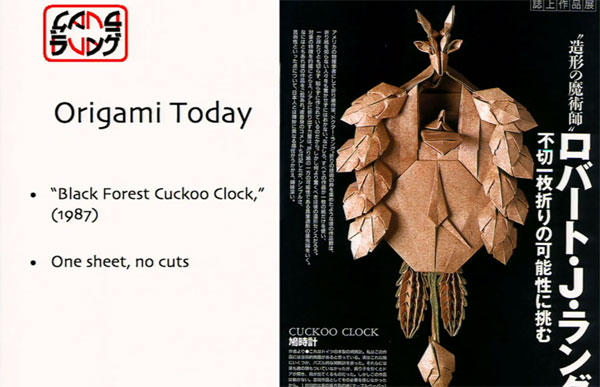 摺紙大師 Robert Lang 在 TED 上的一次演講,完全顛覆了以往我們認知的摺紙行為,他可以用一張沒有切割過的紙,單靠摺的動作,不用膠水或是任何剪接拼貼,就把紙張幻化成非常擬真的動物,甚至利用數學的概念,把這摺紙藝術傳承給大眾,只要四個法則,就可以把摺紙參透到極致。