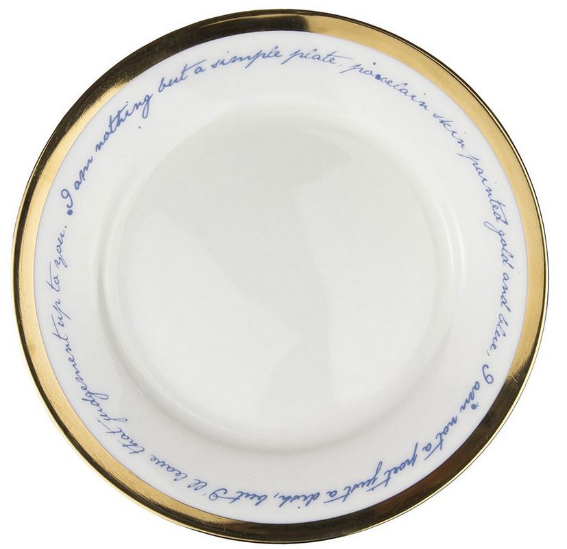 這款瓷盤組以白色骨瓷製作,旁邊鑲有金色花邊,但真正賦予這些瓷器畫龍點睛之美的則是潔白盤面上藍色的仿手寫字句,及旁邊看似無心的點點墨跡。喜歡筆耕的作家們應該會愛死Mineheart的瓷盤,因為他們為了讓商品呈現專屬感,也接受讓客人在餐盤背後寫下自己喜愛的字句。