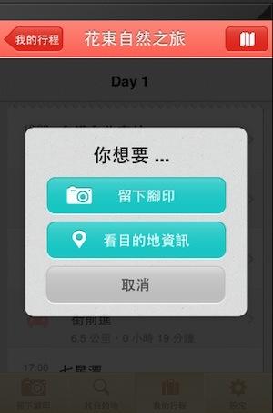 完成既美觀又專業的行程表後,當然是要實際使用才行,這可不是用來交作業的。大家可以選擇把它列印在紙張上,或是用更方便的「玩在台灣」行動APP 來掌握行程。進到APP中點選「我的行程」,不但可以看到事先規劃好的行程,更可以拍照「留下腳印」,以及查看目的地資訊。有了這項功能讓大家只需要專心玩、用力玩、盡情玩就好,那些聯絡方式和路徑規劃之類的瑣事就通通交給它吧。