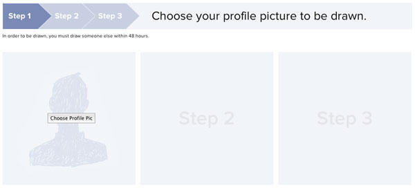 進入到 Selfless Tortraits 的首頁後,總共只需要三個步驟,先把自己想要被畫的大頭照選好之後,第二步驟就會立刻出現一名網友的照片,第三步驟就要上傳你幫網友畫的頭像,接著等待幾個小時,你就會收到 FB 通知你的照片已經畫好了,你可以分享給朋友看、加幫你畫畫的人好友,或是到對方的臉書去逛逛,只要你有個開放的心,能全盤接受網友惡搞你的照片,那就可以繼續這樣的你來我往畫畫遊戲。(不能連續上傳,必須間隔一小時)