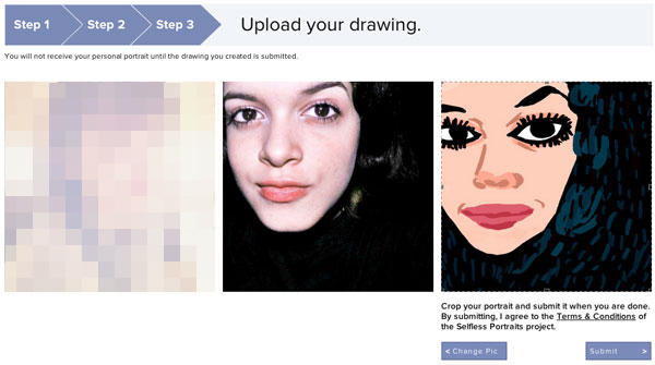 網路上現在有個叫做 Selfless Tortraits 的奇妙網站,只要你有 Facebook 帳號,帳號裡頭有大頭照,就可以請網友幫你畫畫,你完全料想不到你會收到長什麼樣的作品,也無法想像你的頭像會被哪個國家的網友畫到,正是因為這種無法預知的結果,讓人忍不住想上傳自己的照片試試看阿。