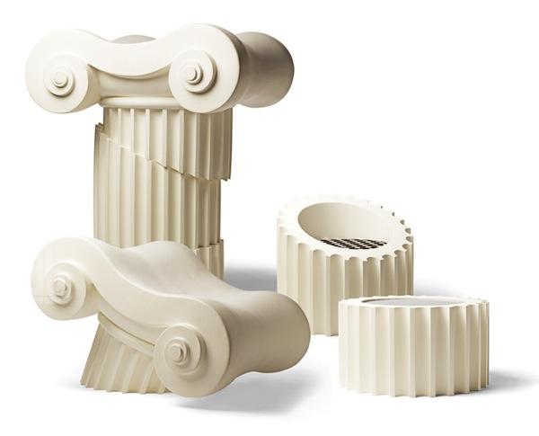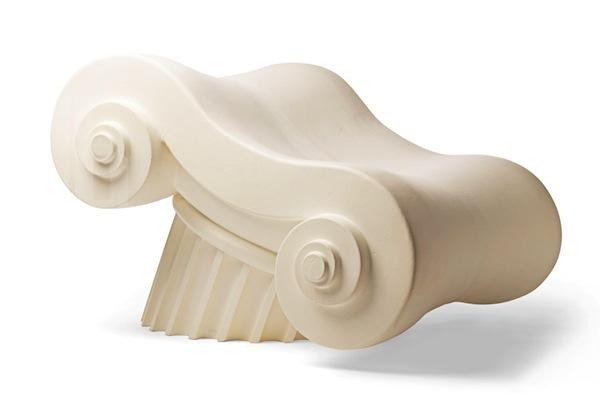 被日本武士設計師一分為三的柱子造型可分成躺椅、矮椅、矮桌三部分,柱頭當然是化身成高雅的躺椅,巧妙的利用角度讓柱子傾斜,將卷渦裝飾變成舒適的椅背。雖然從模特兒的情境照就能看出這躺椅一點都不躺,不過外型的確是有質感的沒話說,再加上材質選用聚氨酯(PU)來創造出Q彈又不失支撐力的效果,舒適度應該還是相當值得期待。