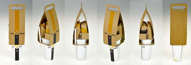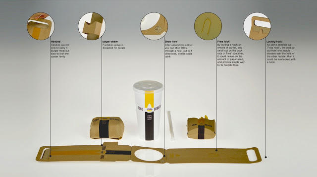 有時看著速食廣告呈現出來的精美畫面,內心總覺得與其一直洗腦說這份餐有多"新鮮美味",不如給我們一個更貼心便利的外袋包裝還比較實際呢!來自美國學生 Seulbi Kim 的創意,以簡約而方便包裝方式來外帶餐點,讓速食也能很有 Style!
