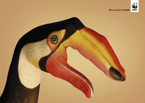 這一系列的圖片上頭只有一句簡短的廣告詞「Give a hand to wildlife」,再搭配上用手繪製在手上的手部彩繪(好繞口),簡單明瞭的告訴大家:請伸出援手來幫助野生動物們!翹起的拇指變成斑馬的耳朵,彎曲的食指變成老鷹喙上的倒勾,四指併攏加上微張的拇指成為了大嘴鳥的招牌,野生動物們在小小的手上卻顯得活靈活現。