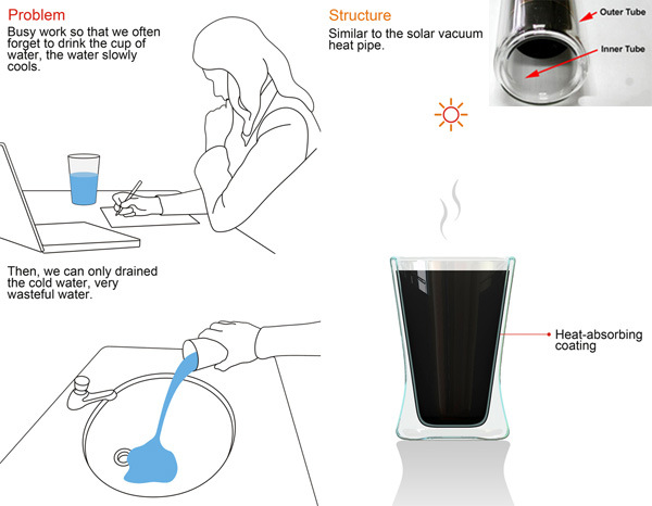 這個概念是讓杯子的外部具備吸收太陽能並轉換成熱能的效果,然後加熱內部的飲料。這個概念雖然還沒被產品化,不過因為創新的概念,入圍了2013 iF Design award – concept design的名單。