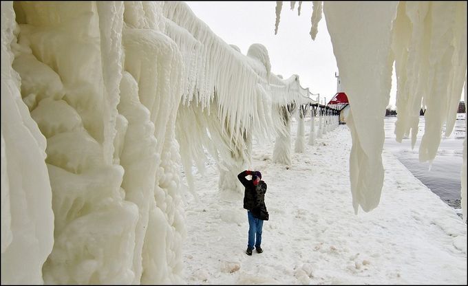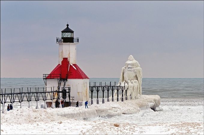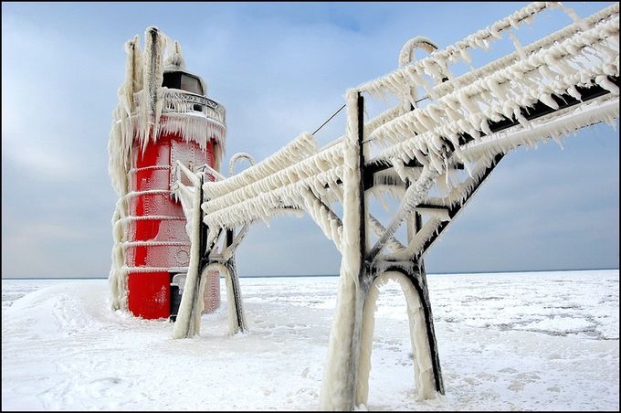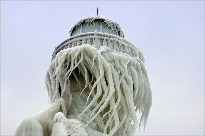 許多攝影師喜歡拍攝雪景,攝影師透過鏡頭,呈現出各種冬季風情,或者夢幻,或者蕭瑟,或者寧靜祥和,或者遼闊壯麗,攝影師Tom Gill 過去幾年冬天,都跑到密西根湖畔拍攝雪景,其中,St. Joseph 燈塔可以稱得上是他的最愛,強風颳起的海浪,打在燈塔上,結成了冰,成了不能說是造型詭異、但絕對稱得上風格迥異的冰之雕塑,瞧瞧,這些覆蓋在燈塔上的長長「鬍鬚」,看起來有沒有比深海閻王更章魚臉呢?