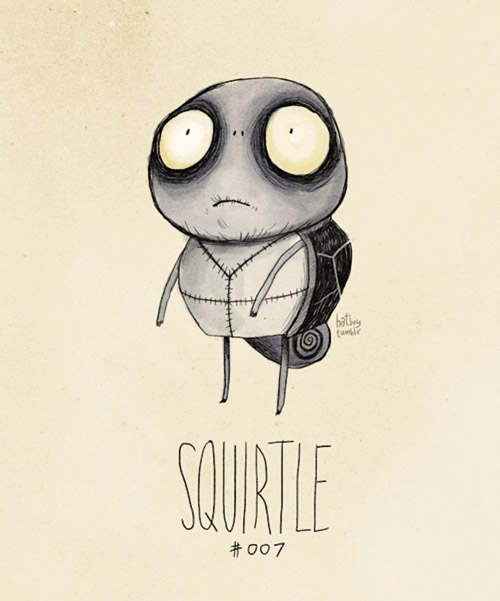 我們都著迷於提姆波頓詭譎駭異的視覺風格,與他所建構的瑰奇黑色童話世界。也經常不時回味童年那群奇形怪狀的口袋怪獸們,無論是皮卡丘、小火龍、妙娃種子還是傑尼龜,都屬於孩子緊抱掌上機的彩色夢幻時代。一位熱愛提姆波頓的設計系學生 Vaughn Pinpin ,異想天開將口袋怪獸重新以提姆波頓風格繪畫。他一共設計了 151 個提姆波頓風格的口袋怪獸。將雙眼無辜的神奇寶貝,變幻成瞪大月光黃色雙眼、涎著綠光唾沫,邪惡地呲牙裂嘴的怪物。當原本來自愛與魔力世界的神奇寶貝,成為地獄陰獸,童年的記憶是否因此變色呢?