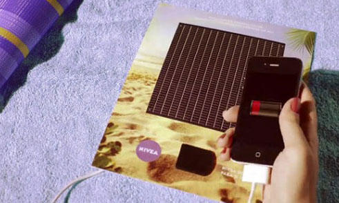 妮維雅製造了一張平面廣告,不過這可不是一像廣告宣傳紙般的平面廣告,而是一張太陽能版廣告。這張太陽能板廣告上附有太陽能板,連接著一個智慧型手機充電插頭。如此一來,海灘邊的帥哥美女就能夠一邊戲水,一邊將手機插在這張太陽能廣告看板上,源源不絕的一直充電。妮維雅可真是徹底的消費太陽能阿,太陽越大錢賺的越多,消費者免費充電充的越開心,妮維雅賺了錢又賺了品牌聲望。